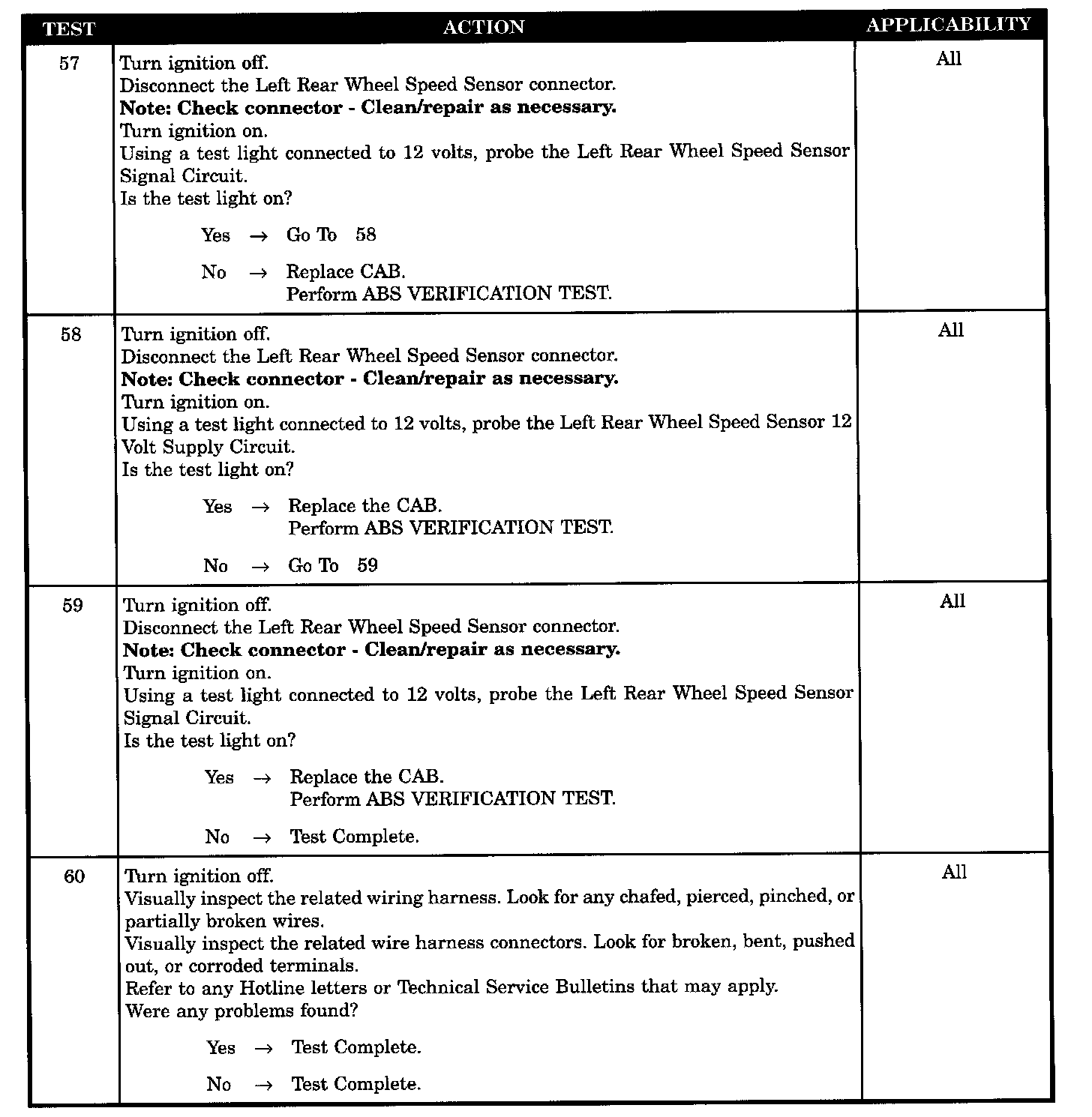 Set Condition: If the CAB detects an open or shorted wheel speed sensor circuit, the Diagnostic Trouble Code (DTC) will set.