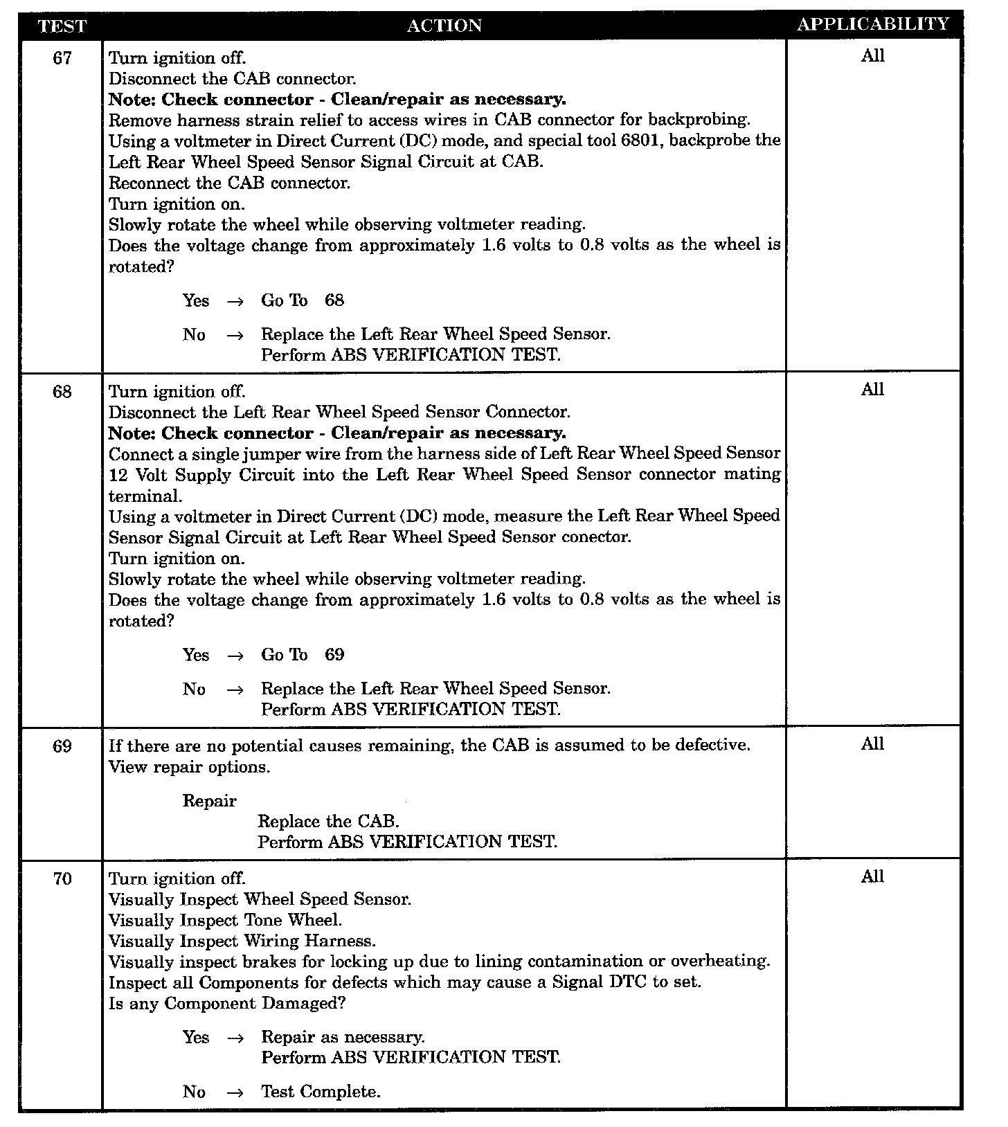 Set Condition: If, during an ABS stop, the CAB commands any valve solenoid on for an extended length of time, and does not see a corresponding wheel speed change, the Diagnostic Trouble Code (DTC) is set. The DTC can also set if the signal is missing or erratic.