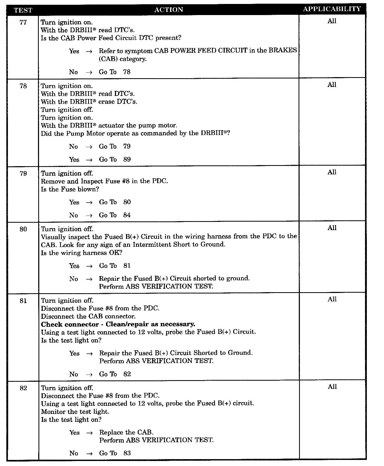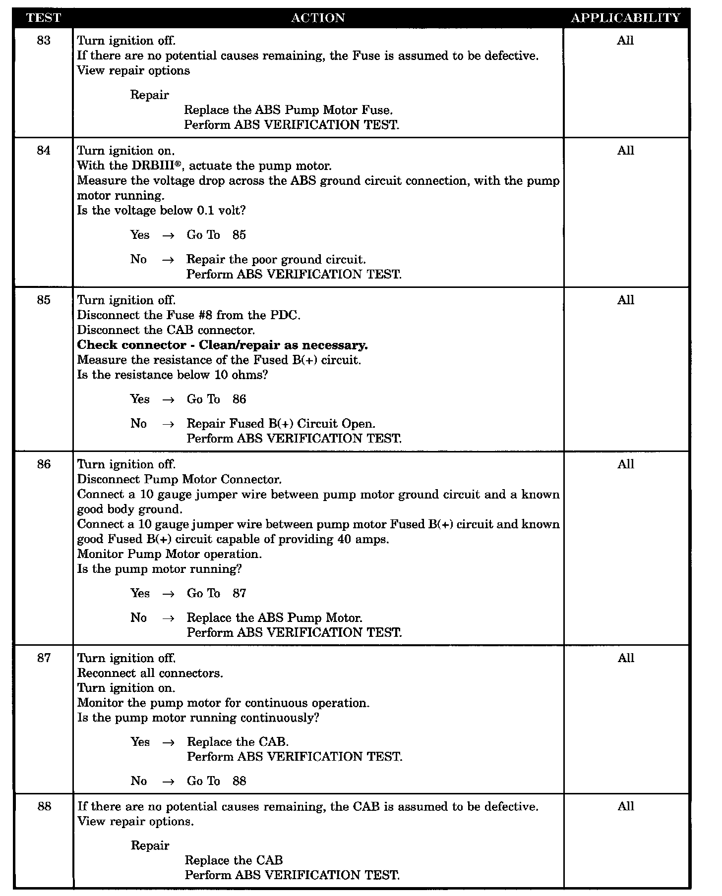 When Monitored: Ignition on. The CAB commands the pump on at 25 km/h (15 mph) to check its operation, if the brake switch is not applied. If the driver has their foot on the brake, the test will run at 40 km/h (25 mph). The CAB monitors pump voltage every 7 milliseconds.