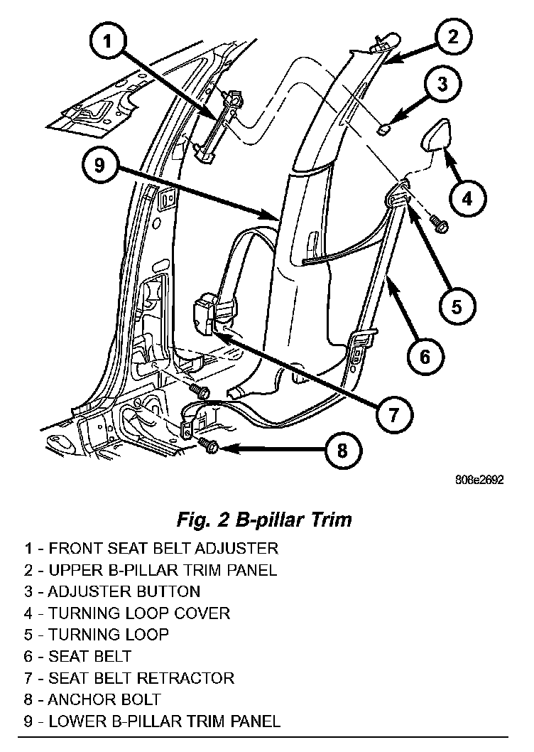 1. Remove bolt attaching lower seat belt anchor to floor pan kick-up (Fig. 2).