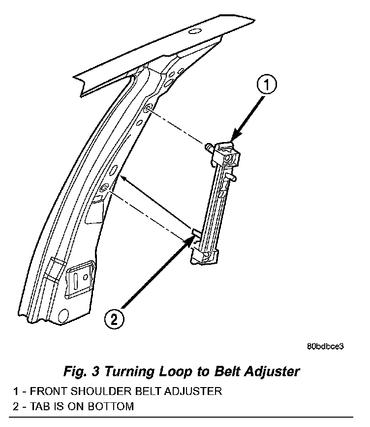 5. Remove bolt attaching turning loop to belt adjuster (Fig. 3).