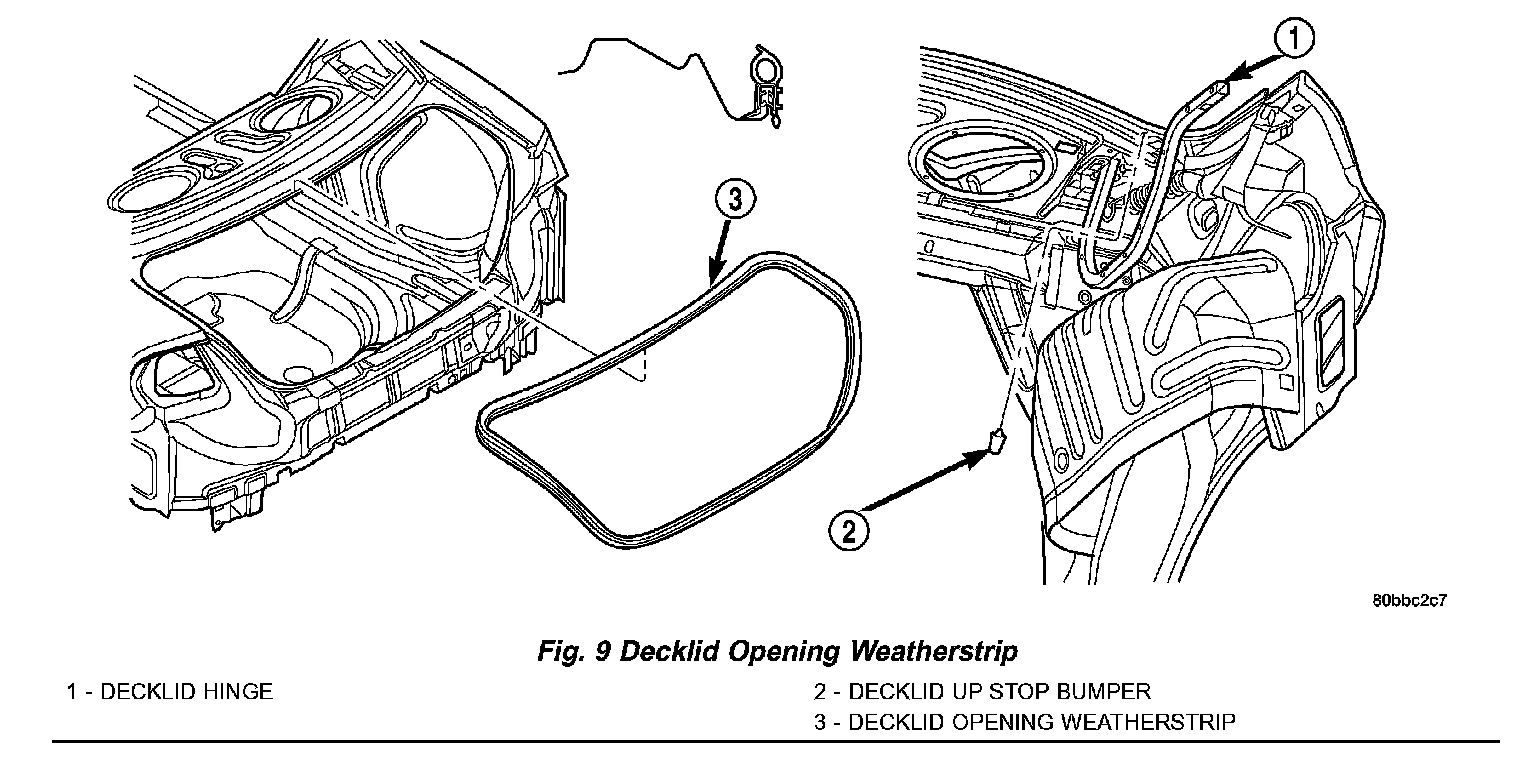 2. Pull decklid weatherstrip form decklid opening fence (Fig. 9).