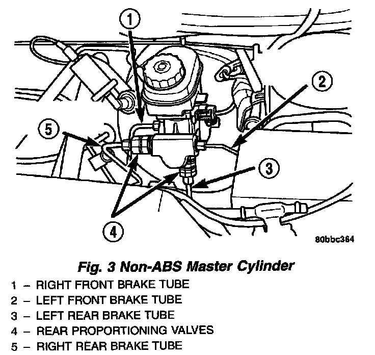 The non-ABS master cylinder is a four-outlet design with two screw-in proportioning valves. One is attached directly to the inboard side of the master cylinder housing while the other is attached to the bottom. Vehicles equipped with rear drum brakes use a master cylinder with a 22.23 mm (0.875 inch) bore diameter, while vehicles equipped with rear disc brakes use a 23.82 mm (0.937 inch) bore diameter master cylinder.