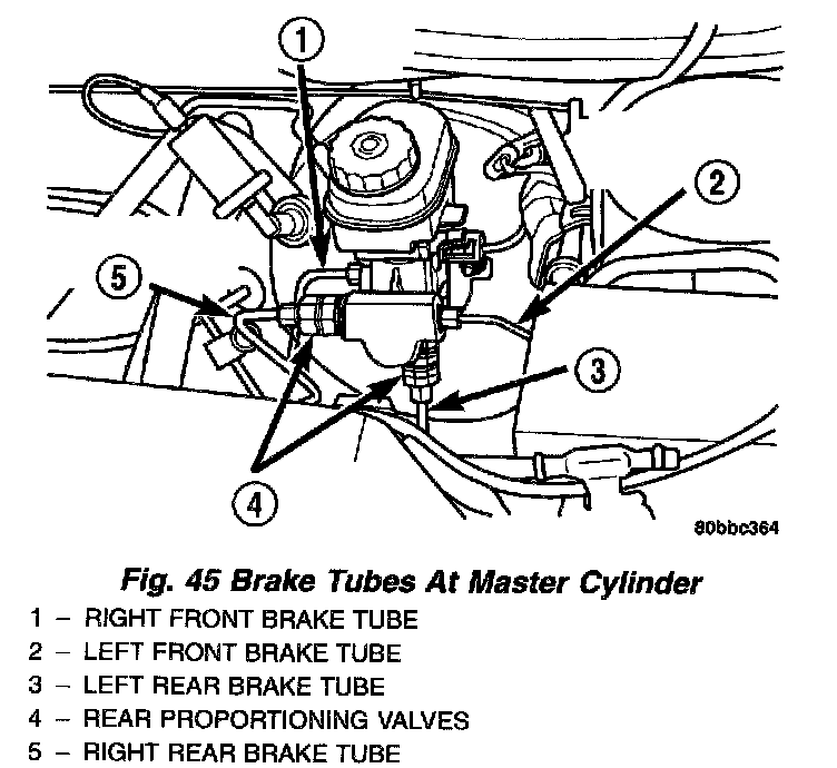 5. Disconnect the two brake tubes from the master cylinder, and two brake tubes from the proportioning valves . Install plugs at all of the open brake tube outlets on the master cylinder.