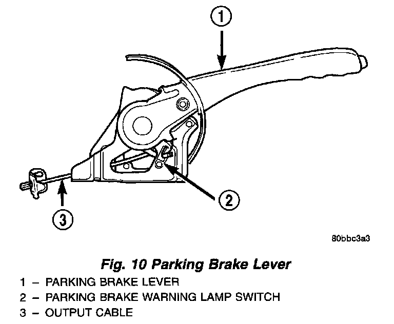 All vehicles are equipped with a center-mounted, hand-operated parking brake lever mounted between the front seats. This lever is an automatic adjusting type that continuously applies minimal tension to the parking brake cables to keep them in adjustment at all times. Due to this feature, the parking brake cable system does not require adjustment. Proper parking brake system adjustment is obtained by proper drum brake or drum-in-hat brake shoe adjustment. When service is needed, the lever auto-adjust mechanism must be reloaded and locked out before service can be performed.