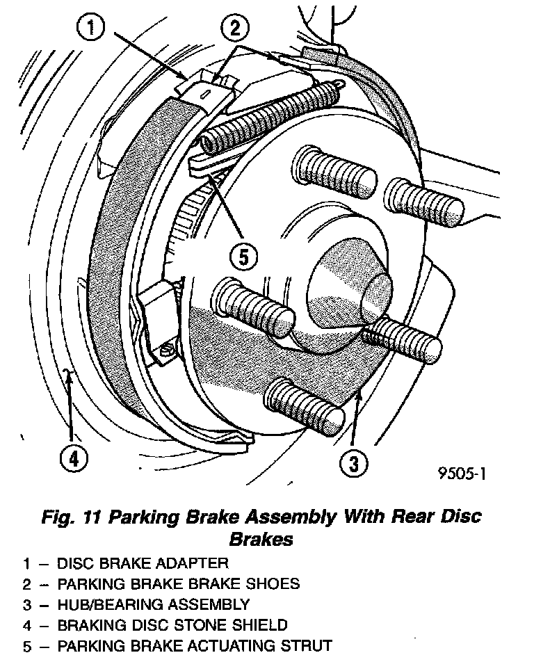 The parking brakes on vehicles equipped with rear disc brakes consist of a small duo-servo brake assembly mounted to the disc brake caliper adapter. The hat (center) section of the rear brake rotor serves as the braking surface (drum) for the parking brakes. This parking brake application uses the same operating cable configuration as the drum brake equipped vehicles, but different cables.