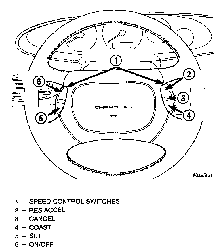 The speed control system is electronically controlled and vacuum operated. The electronic control is integrated into the Powertrain Control Module which is located in the engine compartment. The controls are located on the steering wheel and consist of five switches. The ON, OFF and SET buttons are located on the left side of the airbag module. The RESUME, ACCEL, COAST and CANCEL buttons are located on the right side of the airbag module.