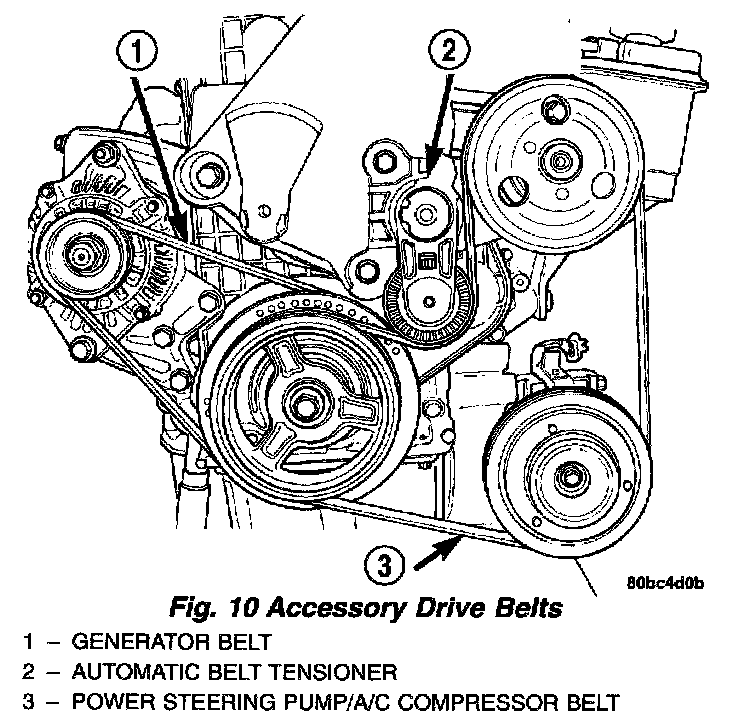 The accessory drive consist of two Poly-V type drive belts. One belt drives the generator, the other drives the power steering pump and air conditioning compressor (if equipped). The power steering/air conditioning belt is tensioned by an automatically controlled belt tensioner. The generator belt is manually tensioned using an adjusting bolt and a locking nut.