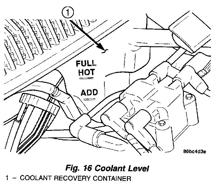 NOTE: Do not remove radiator cap for routine coolant level inspections.The coolant recovery/reserve system provides a quick visual method for determining the coolant level without removing the radiator cap. Simply observe, with the engine idling and warmed up to normal operating temperature, that the level of the coolant in the recovery/reserve containe is between the FULL HOT and ADD marks.