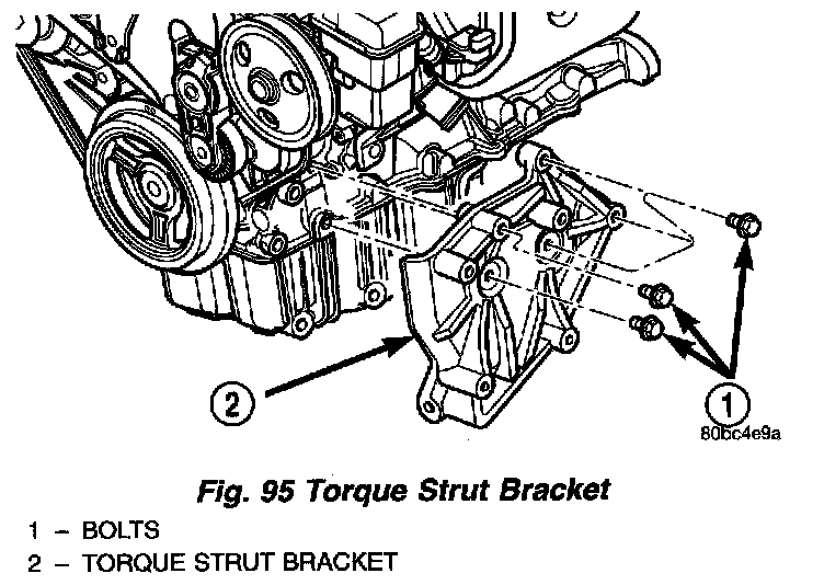 10. Remove lower torque strut/air conditioning compressor mounting bracket from engine (Fig. 95).