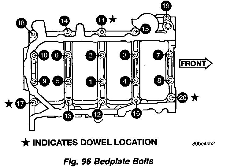 9. Install main bearing bedplate to engine block bolts (11-20), with baffle studs in positions 12, 13 and 16 and torque each bolt to 34 Nm (25 ft. lbs.) in sequence shown in (Fig. 100).