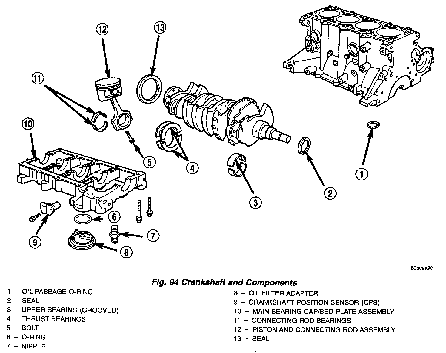 The crankshaft is supported in five main bearings. All upper bearing shells in the crankcase have oil grooves. All lower bearing shells installed in the (bedplate) main bearing cap are plain. Crankshaft end play is controlled by a flanged bearing on the number three main bearing journal (Fig. 97).