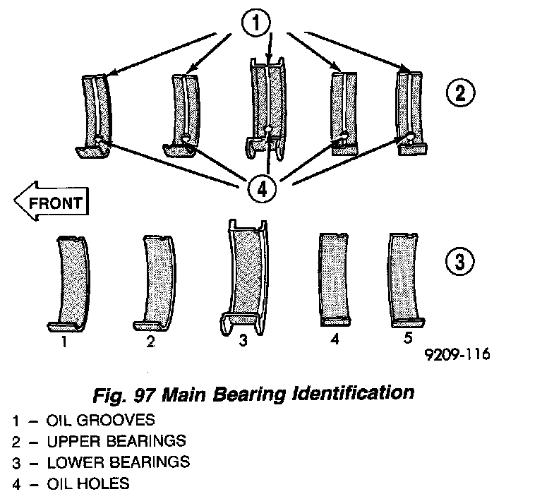 NOTE: The upper and lower main Bearing shells are Not interchangeable. The lower shells have a revised tab to prevent improper installation.