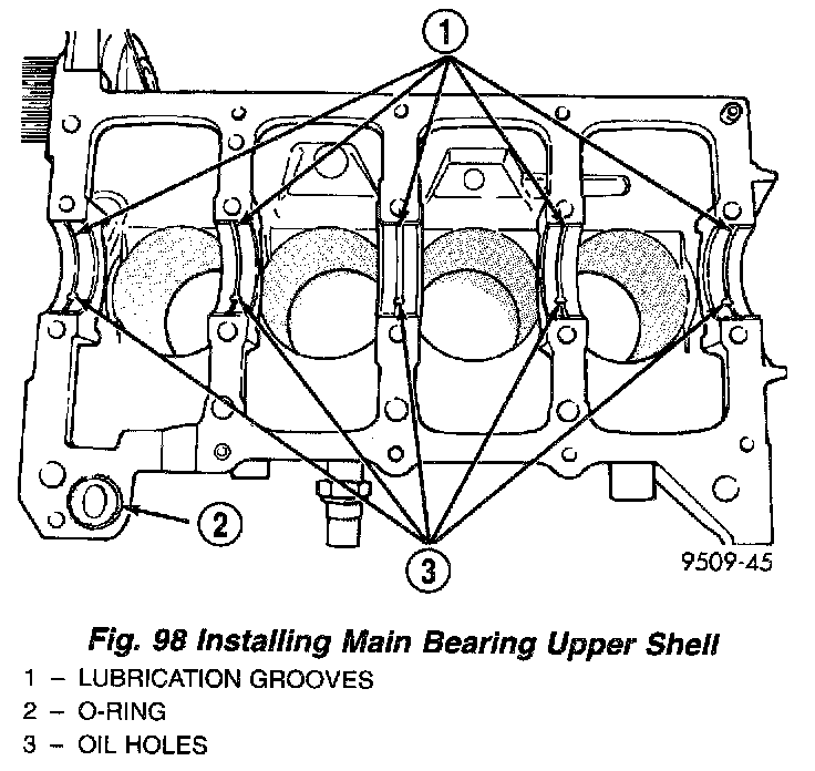 1. Install the main bearing shells with the lubrication groove in the cylinder block. Install O-ring into recess in the block (Fig. 98).