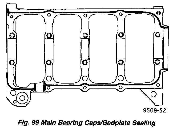 4. Apply 1.5 - 2.0 mm (0.059 - 0.078 inch) bead of Mopar Bed Plate Sealant to cylinder block as shown in (Fig. 99).