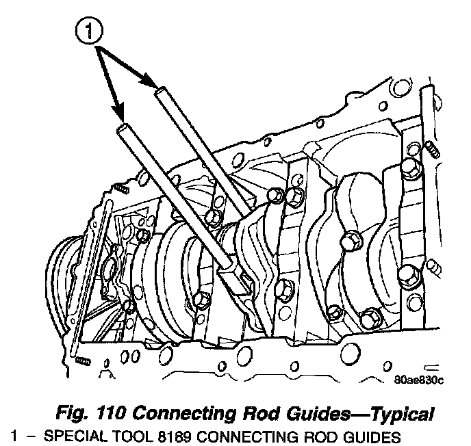 7. To protect crankshaft journal and fractured rod surfaces, install Special Tool 8189, connecting rod guides onto connecting rod (Fig. 110). Carefully push each piston and rod assembly out of cylinder bore.