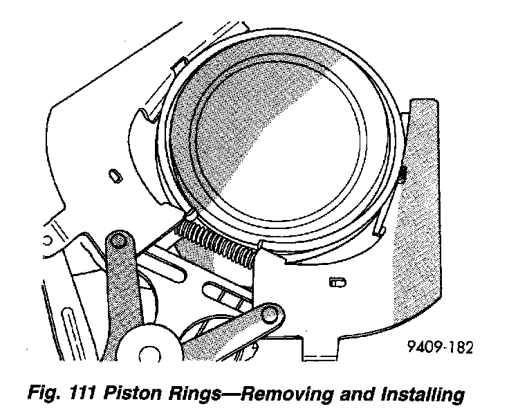 2. Using a suitable ring expander, remove upper and intermediate piston rings (Fig. 111).