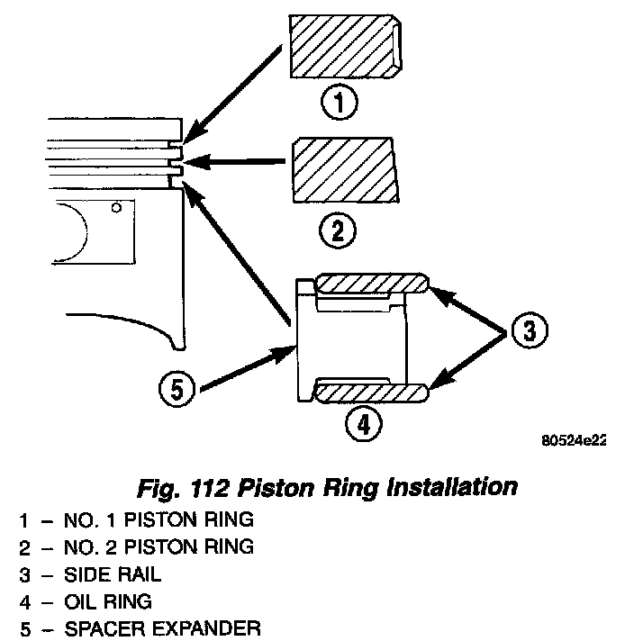 3. Install No. 2 piston ring and then No. 1 piston ring (Fig. 112).