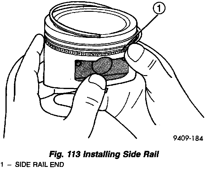 f. Install the side rail by placing one end between the piston ring groove and the expander. Hold end firmly and press down the portion to be installed until side rail is in position. Do not use a piston ring expander (Fig. 113).