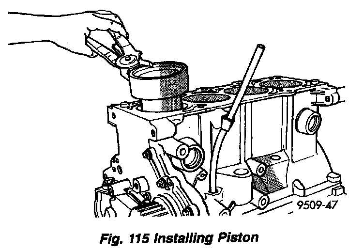 3. Immerse the piston head and rings in clean engine oil, slide the ring compressor, over the piston (Fig. 115). Be sure position of rings does not change during this operation.