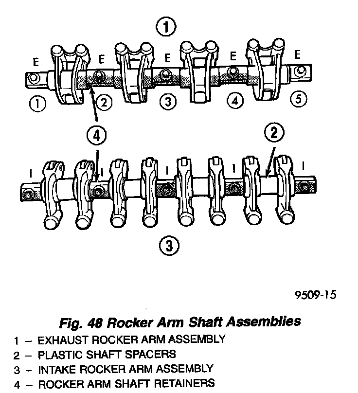 4. Identify the rocker arms spacers and retainers for reassembly. Disassemble the rocker arm assemblies by removing the attaching bolts from the shaft (Fig. 48).
