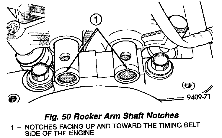 2. Install rocker arm and shaft assemblies with NOTCH in the rocker arm shafts pointing up and toward the timing belt side of the engine (Fig. 50). Install the retainers in their original positions on the exhaust and intake shafts (Fig. 48).
