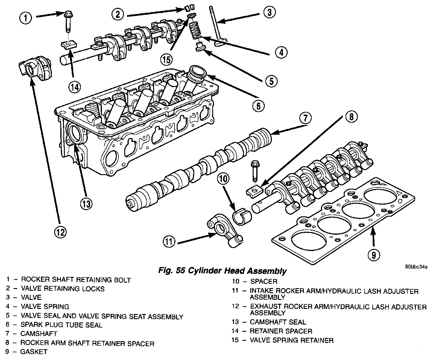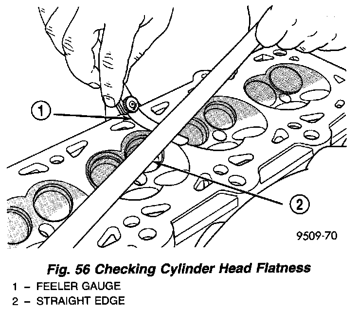 NOTE: Inspect camshaft bearing journals for scoring. Cylinder head must be flat within 0.1 mm (0.004 inch) (Fig. 56).