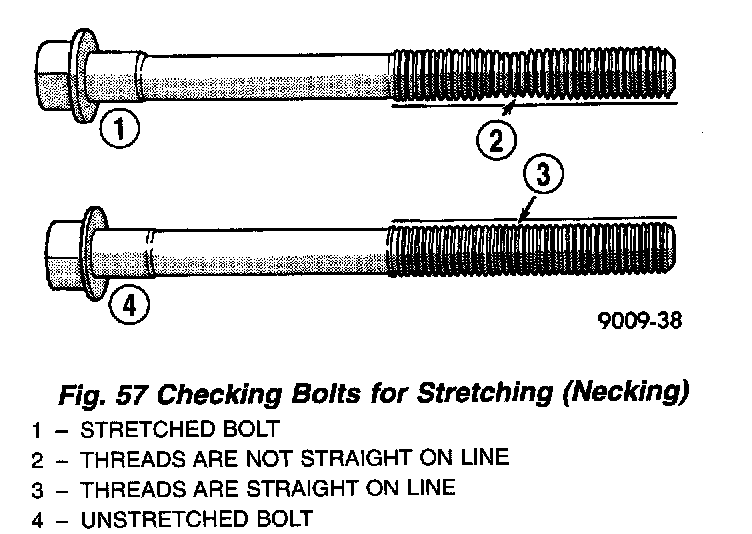 NOTE: The cylinder head bolts should be examined BEFORE reuse. If the threads are necked down, the bolt(s) should be replaced (Fig. 57).