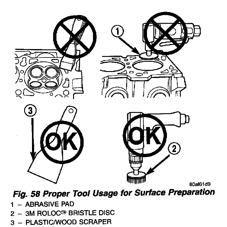 CAUTION: When cleaning cylinder head and cylinder block surfaces, DO NOT use a metal scraper. Sealing surfaces could be cut or ground, resulting in gasket leaks. Use only the cleaning methods shown in (Fig. 58). If required, use a white (120 grit) 3M Roloc bristle disk on aluminum surfaces. A yellow (80 grit) bristle disk can be used on cast iron surfaces with care.
