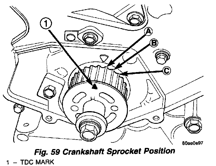4. Position crankshaft sprocket to TDC, then rotate crankshaft until mark is three teeth before TDC (Fig. 59). This will ensure that no piston-to-valve contact occurs upon installation of cylinder head in the event of camshaft rotation.