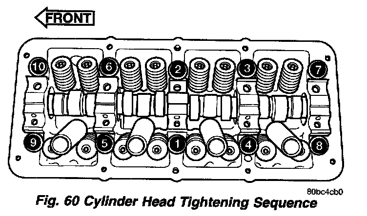 7. Tighten the cylinder head bolts in the sequence shown in (Fig. 60). Using the 4 step torque method, tighten according to the following values: