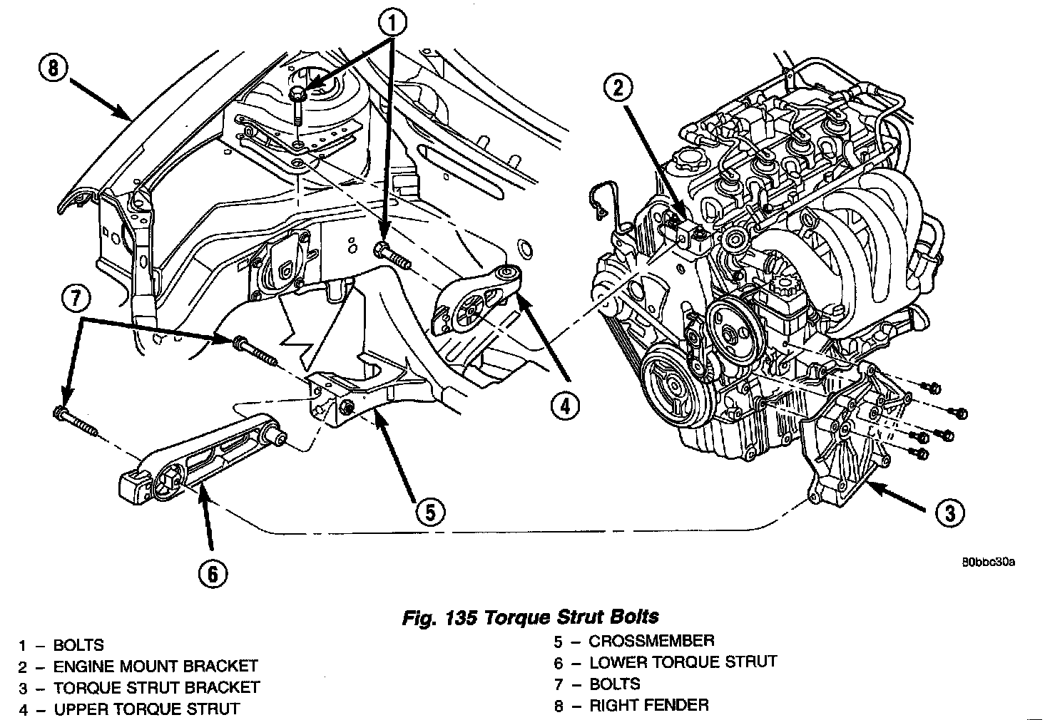 1. Loosen the upper and lower torque strut attaching bolt at the suspension crossmember and shock tower bracket (Fig. 135).