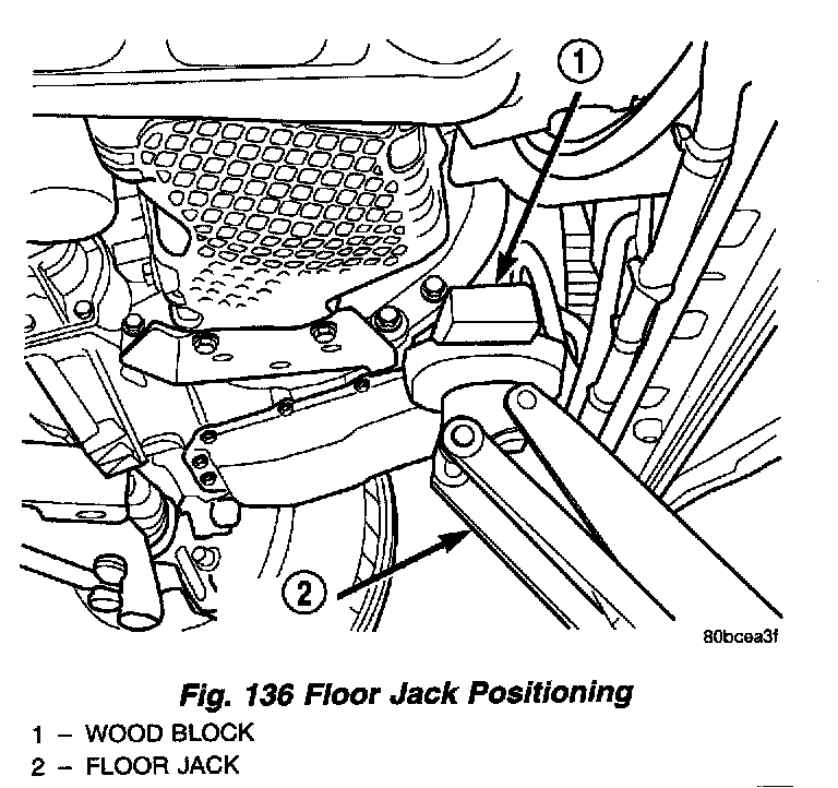 NOTE: The floor jack must be positioned as shown in (Fig. 136) to prevent minimal upward lifting of the engine.