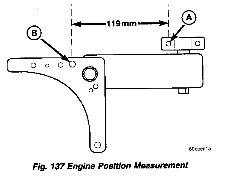 3. Carefully apply upward force, allowing the upper engine to rotate rearward until the distance between the center of the rearmost attaching stud on the engine mount bracket (point "A") and the center of the hole for the washer hose clip on the shock tower bracket (point "B") is 119 mm (4.70 inch) (Fig. 137).