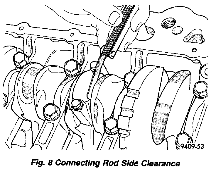 5. Using a feeler gauge, check connecting rod side clearance (Fig. 8). Refer to General Specifications for connecting rod specifications. Engine Specifications