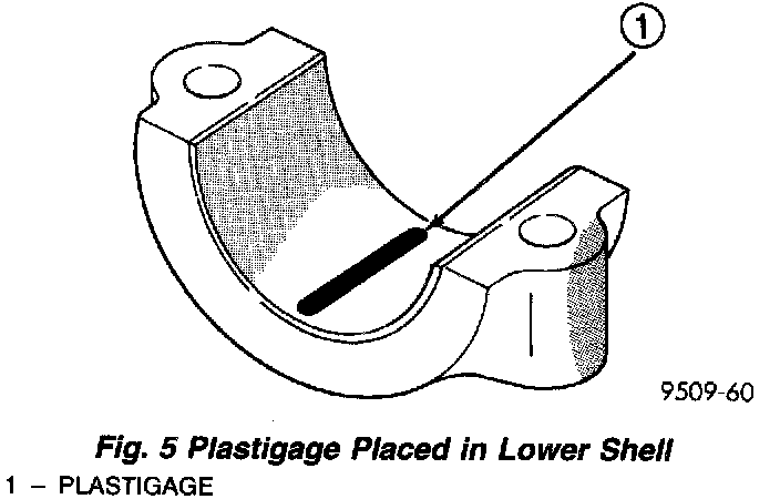 2. Place a piece of Plastigage across the entire width of the bearing shell in the cap approximately 6.35 mm (1/4 inch) off center and away from the oil holes (Fig. 5). (In addition, suspected areas can be checked by placing the Plastigage in the suspected area). Torque the bearing cap bolts of the bearing being checked to the proper specifications.
