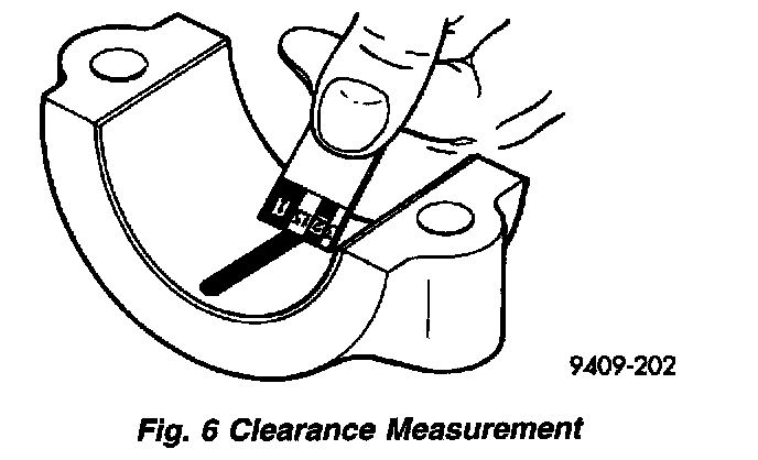5. Remove the bearing cap and compare the width of the flattened Plastigage (Fig. 6) with the scale provided on the package. Locate the band closest to the same width. This band indicates the amount of oil clearance. Differences in readings between the ends indicate the amount of taper present. Record all readings taken. Refer to General Specifications. Engine Specifications Plastigage generally is accompanied by two scales. One scale is in inches, the other is a metric scale. If the bearing clearance exceeds wear limit specification, replace the bearing.