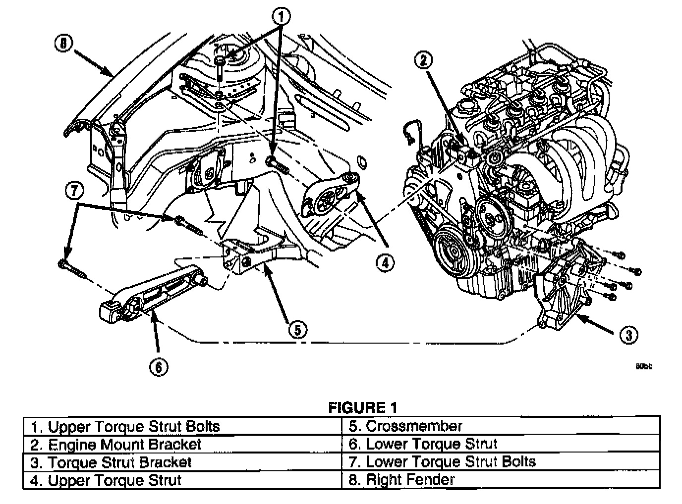 8. Remove the bolts attaching the upper torque strut to the shock tower bracket and engine mount bracket (Figure 1).