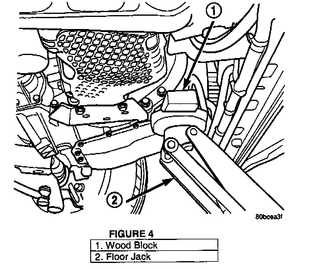 THE FLOOR JACK MUST BE POSITIONED AS SHOWN IN FIGURE 4 TO PREVENT MINIMAL UPWARD LIFTING OF THE ENGINE.
