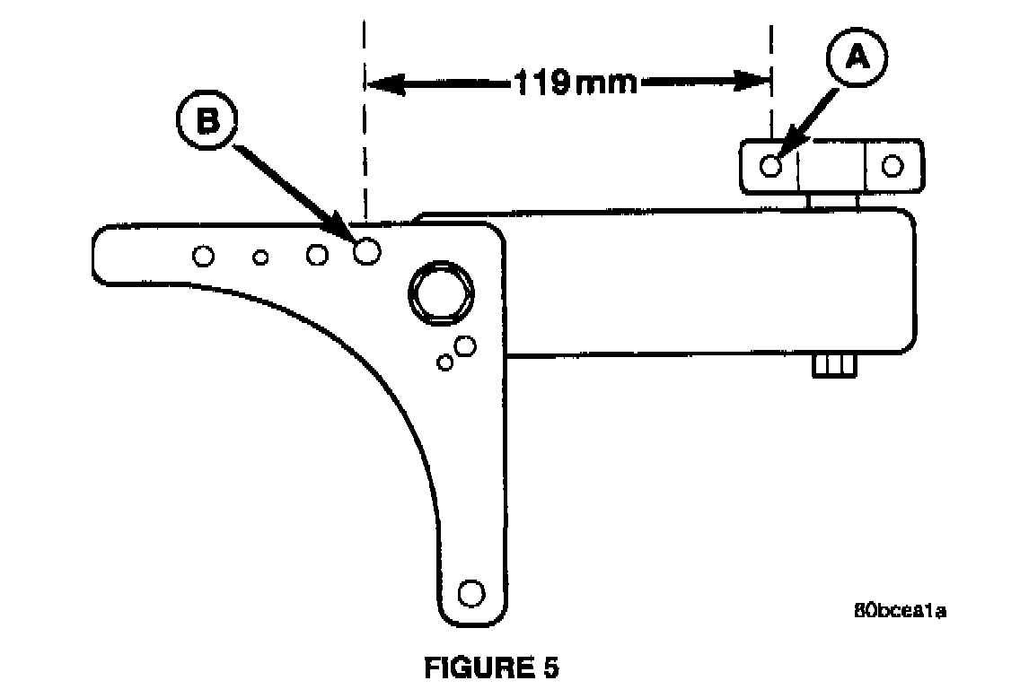 36. **Carefully apply upward force, allowing the upper engine to rotate rearward until the distance between the center of the rearmost attaching stud on the engine mount bracket (point "A") and the center of the hole for the washer hose clip on the shock tower bracket (point "B") is 119 mm (4.70 in.) (Figure 5). Torque the upper strut bolts to 118 Nm (87 ft. lbs.).**