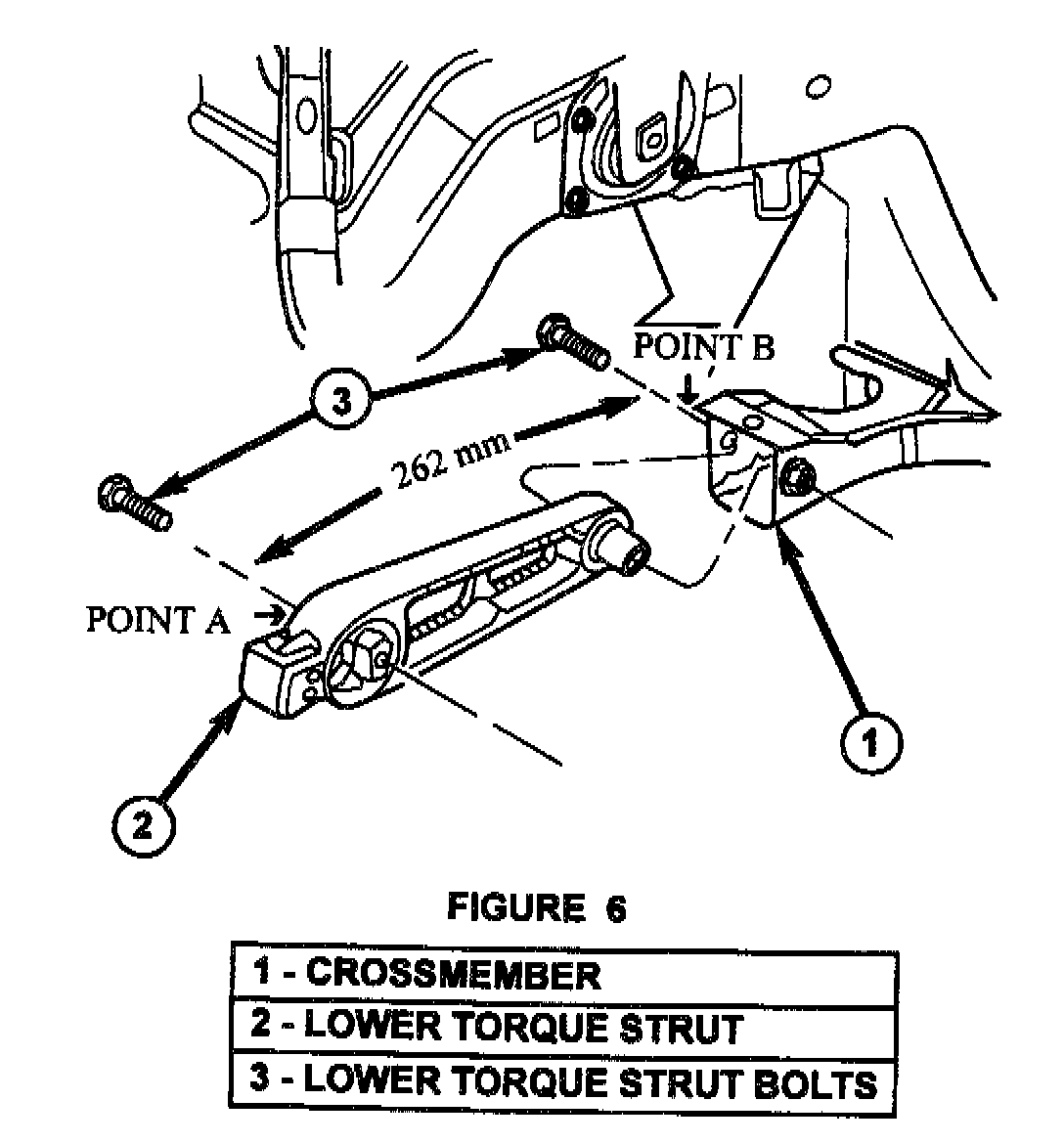 37. **Adjust the lower torque strut to allow a distance of 262 mm (10.30 in.) from the center point of the bolt in the torque strut bracket (point "A") and the center of the bolt in the crossmember (point "B") (Figure 6). Torque the bolts to 118 Nm (87 ft. lbs.).**