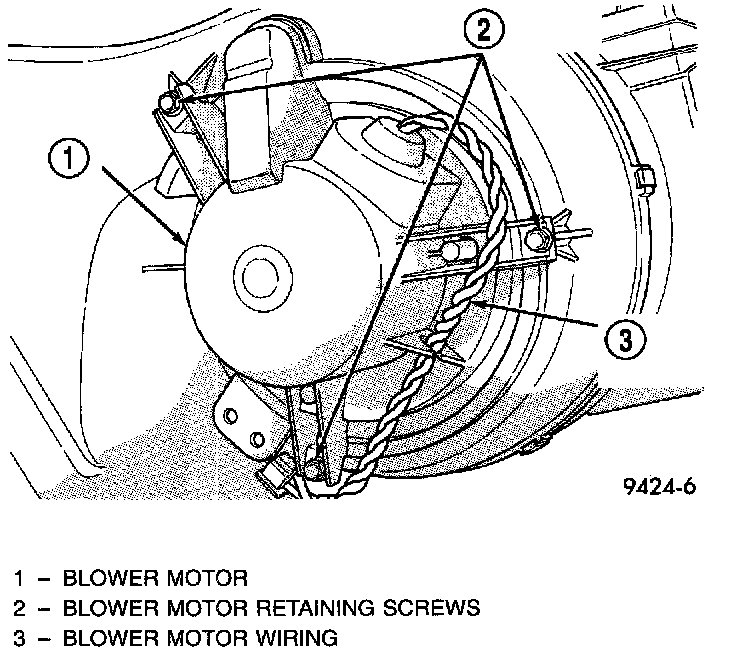 The blower motor is located on the bottom right side of the unit housing. The blower motor can be removed from the vehicle without having to remove the unit housing assembly.REMOVAL