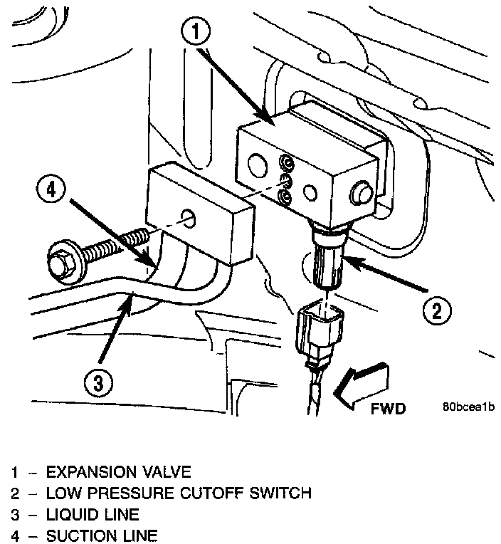 The Low Pressure Cut Off Switch monitors the refrigerant gas pressure on the suction side of the system. The low pressure cut off switch is located on the expansion valve. The low pressure cut off switch turns off voltage to the compressor clutch coil when refrigerant gas pressure drops to levels that could damage the compressor. The low pressure cut out switch is a sealed factory calibrated unit. It must be replaced if defective.