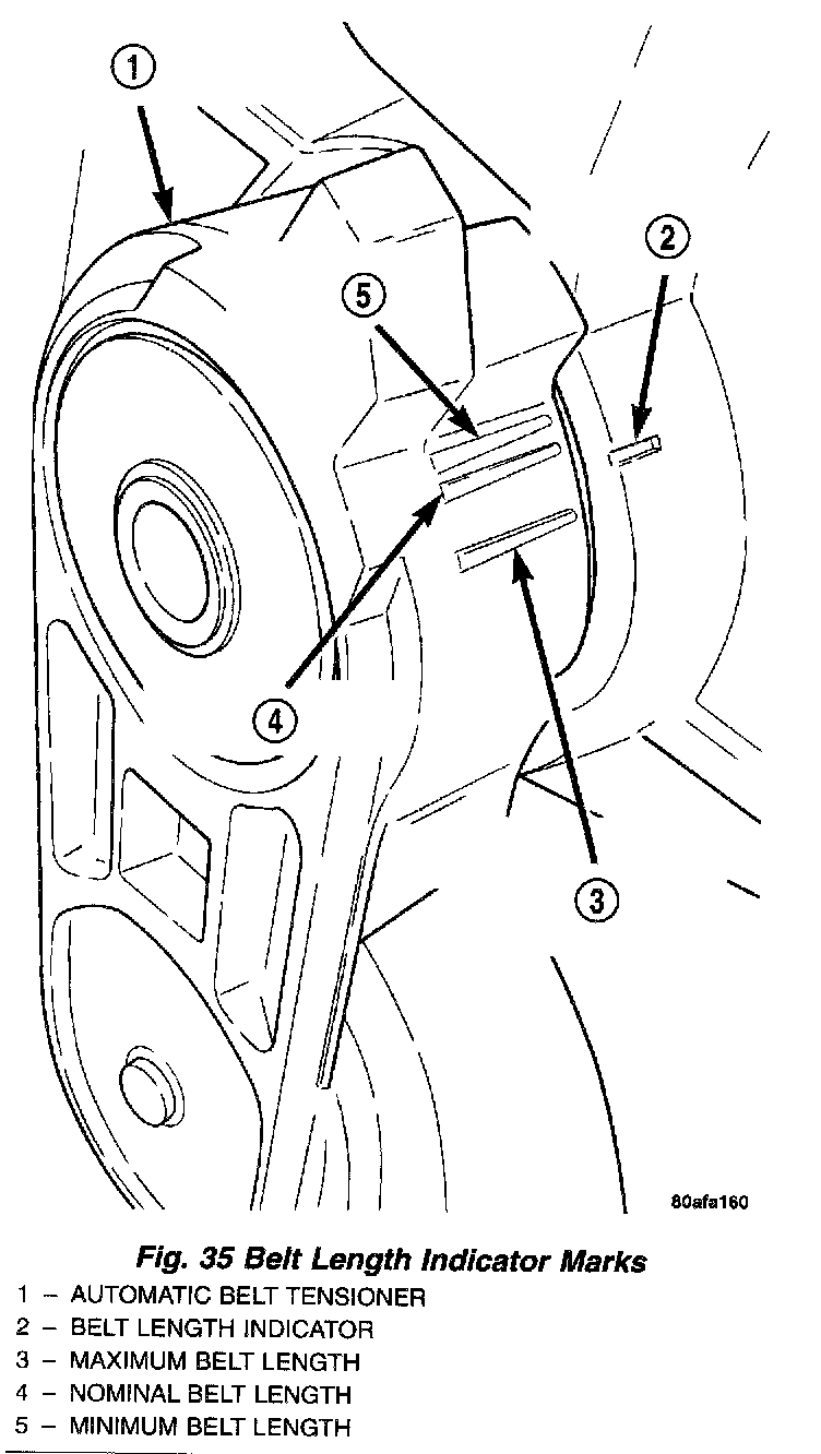 3. After belt is installed, inspect belt length indicator marks (Fig. 35). The indicator mark should be within the minimum belt length and maximum belt length marks. On a new belt, the indicator mark should align approximately with the nominal belt length mark.