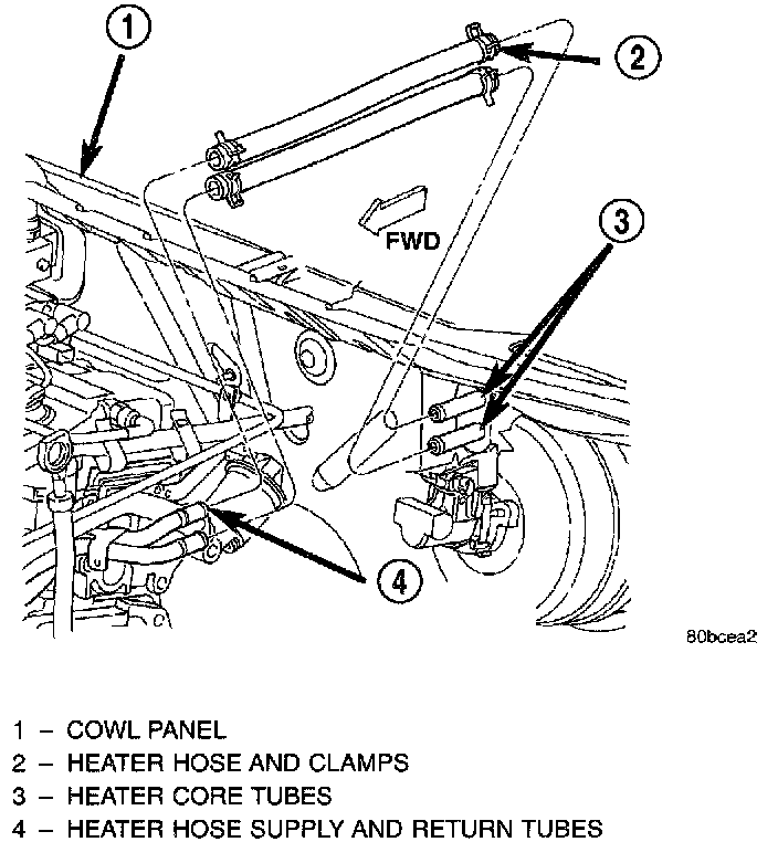 CAUTION: When removing hoses from heater core inlet or outlet nipples DO NOT exert excess pressure. The heater core may become damaged and leak engine coolant.NOTE: Review Cooling System Precautions before proceeding with this operation.