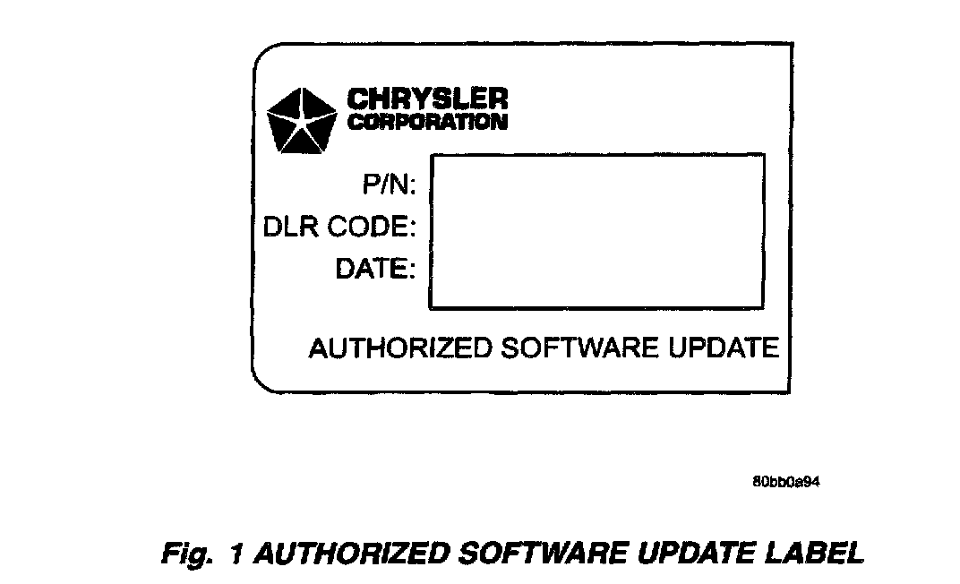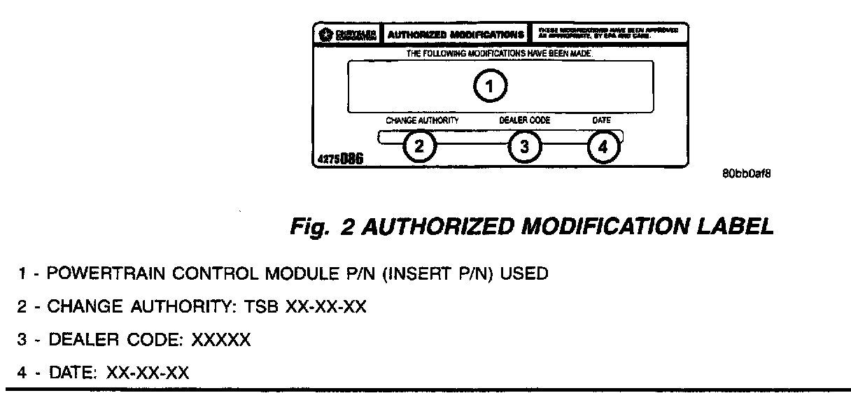 1. Type the necessary information on the "Authorized Software Update Label" p/n 04669020 (Fig. 1). Attach the label to the PCM and cover the label with the clear plastic overlay.