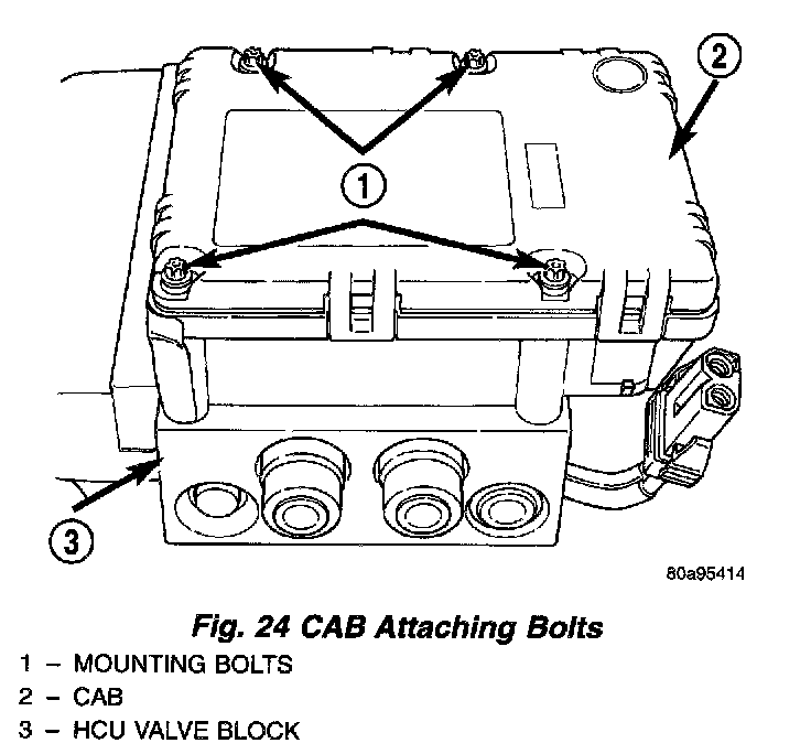 2. Install the 4 bolts mounting the CAB to the HCU. Tighten the CAB mounting bolts to a torque of 2 Nm (17 inch lbs.).