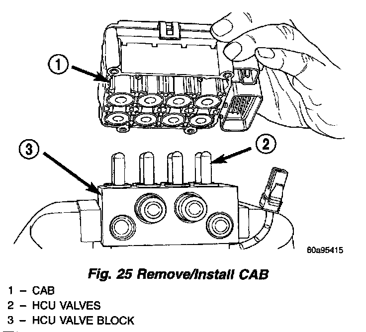 REMOVALNOTE: To replace the hydraulic control unit (HCU) or the controller antilock brake (CAB) on this vehicle, the entire integrated control unit (ICU) needs to be removed from the vehicle. The CAB can then be separated from the HCU. Do not attempt to replace the CAB with the ICU mounted in the vehicle.