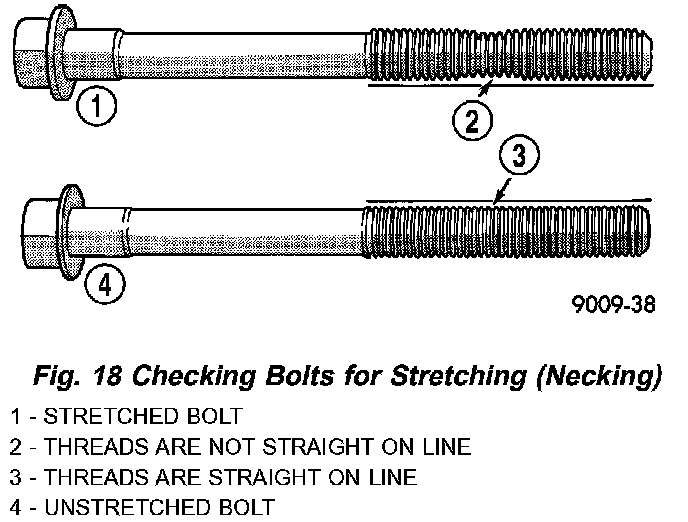 The cylinder head bolts should be examined BEFORE reuse. If the threads are necked down, the bolt(s) should be replaced. Necking can be checked by holding a scale or straight edge against the threads. If all the threads do not contact the scale, the bolt(s) should be replaced.