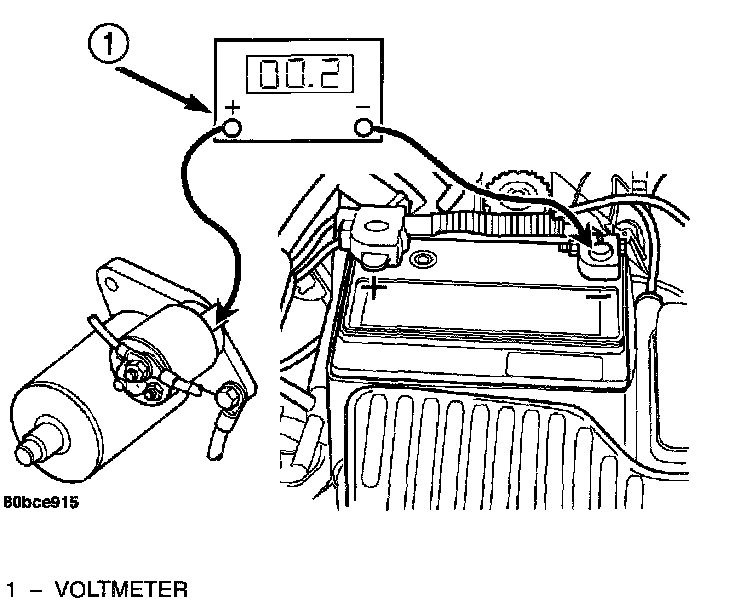 3. Connect positive voltmeter lead to the starter motor housing and the negative lead to the battery negative terminal. Hold the ignition switch key in the START position. If voltage reads above 0.2 volt, correct poor starter to engine ground.